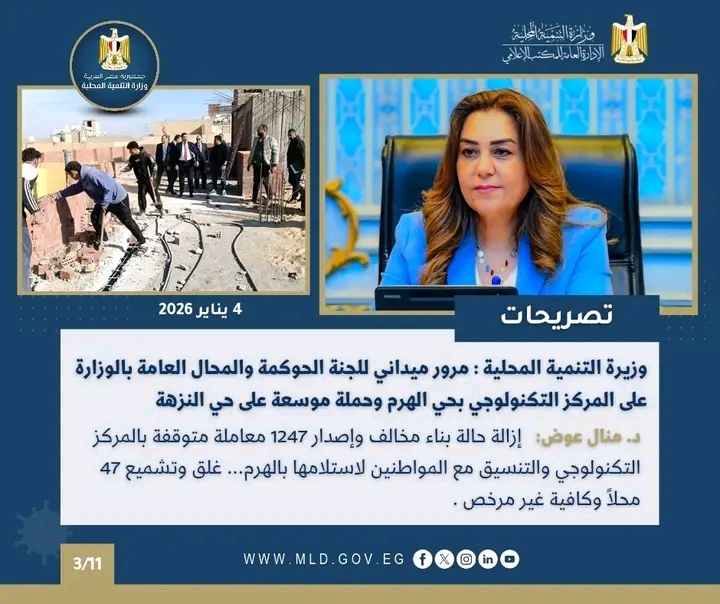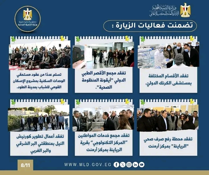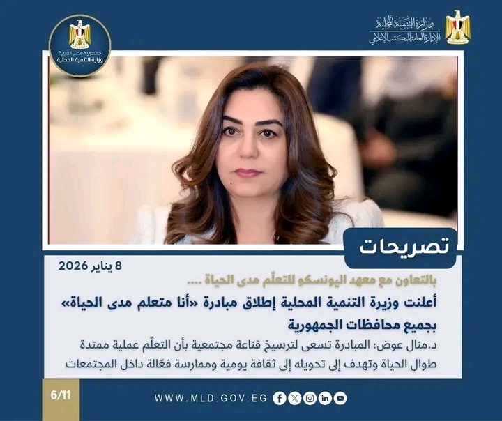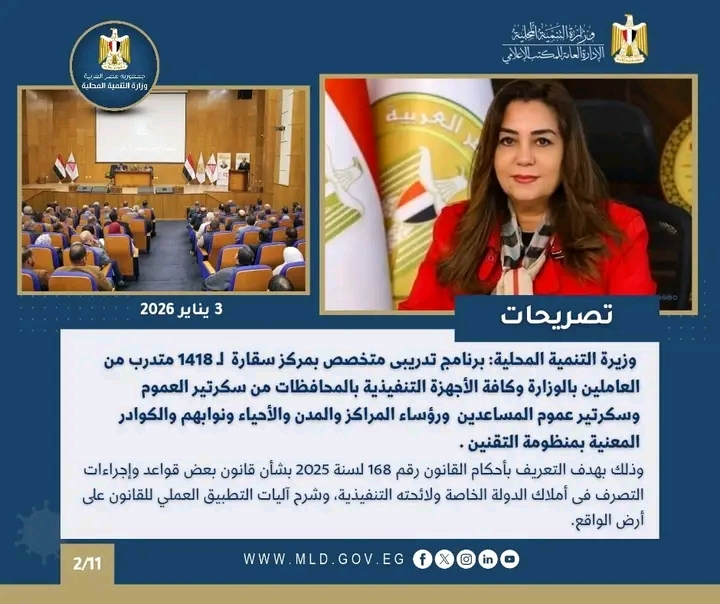 حيث تضم نشرة الحصاد الأسبوعي لرصد أنشطة وزارة التنمية المحلية (2 : 8 يناير 2026)، مجموعة من الفعاليات والاجتماعات ومتابعة المشروعات التنموية المهمة خلال الفترة (2 : 8 يناير 2026).