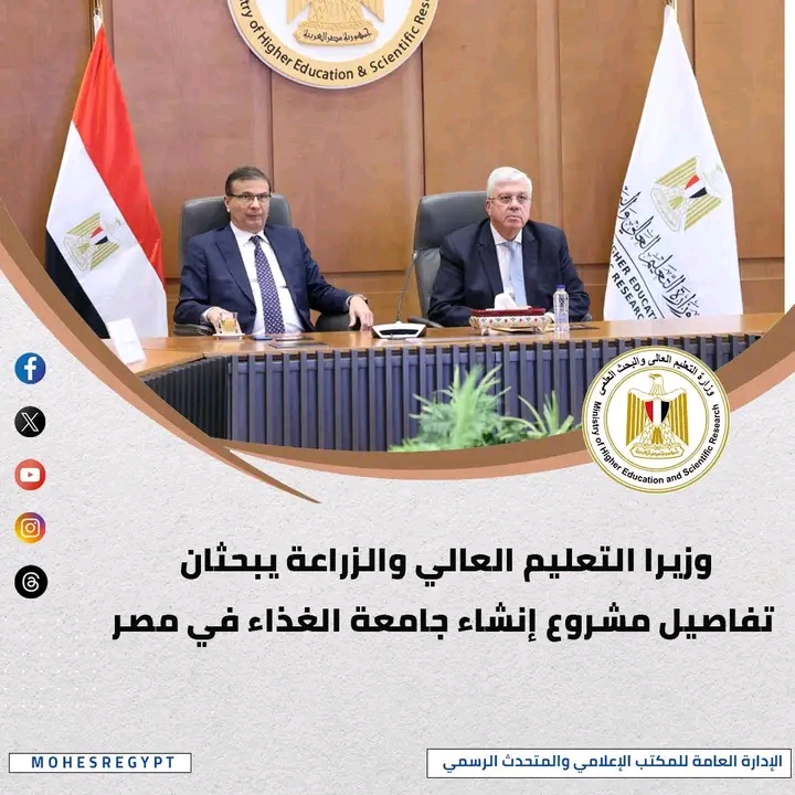 وعقد د.أيمن عاشور وزير التعليم العالي والبحث العلمي، اجتماعًا مع علاء فاروق وزير الزراعة واستصلاح الأراضي؛ لمناقشة الخطوات التنفيذية الخاصة بإنشاء جامعة الغذاء في مصر، وذلك في إطار توجه الدولة نحو استحداث جيل جديد من الجامعات المتخصصة الداعمة للتنمية المستدامة، بما يتوافق مع رؤية مصر 2030، وخلال الاجتماع.
