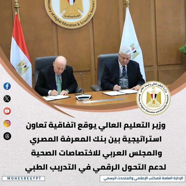 كما وقع الدكتور أيمن عاشور، وزير التعليم العالي والبحث العلمي ورئيس مجلس إدارة بنك المعرفة المصري، اتفاقية تعاون استراتيجية بين بنك المعرفة المصري (EKB) والمجلس العربي للاختصاصات الصحية (ABHS)، وذلك في إطار تعزيز التحول الرقمي في منظومة التدريب الطبي ودعم بناء القدرات الصحية على المستوى العربي.