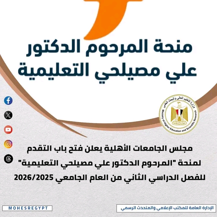 أعلن مجلس الجامعات الأهلية عن تقديم عدد من المنح التعليمية الممولة من الهيئة العامة لبنك ناصر الاجتماعي، ضمن منحة " الدكتور علي مصيلحي التعليمية"، للفصل الدراسي الثاني من العام الجامعي 2025/2026، بشرط وجود استحقاق اجتماعي لطلاب المدارس الحكومية، والمدارس التجريبية أو ما يعادلها من مدارس STEM، ومدارس النيل من الدور الأول للعام 2024/2025، وتغطي المنحة كافة المصروفات الدراسية، على أن تتكفل الجامعة الأهلية الملتحق بها الطالب بتوفير سكن طلابي مناسب (يشتمل التغذية) يماثل المدن الجامعية، وذلك بدون مقابل.