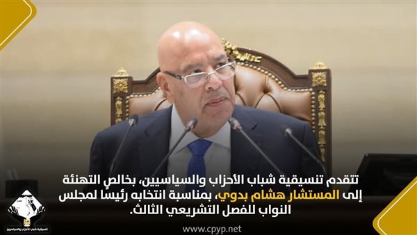 تقدمت تنسيقية شباب الأحزاب والسياسيين، بخالص التهنئة إلى المستشار هشام بدوي، بمناسبة انتخابه رئيسًا لمجلس النواب للفصل التشريعي الثالث.