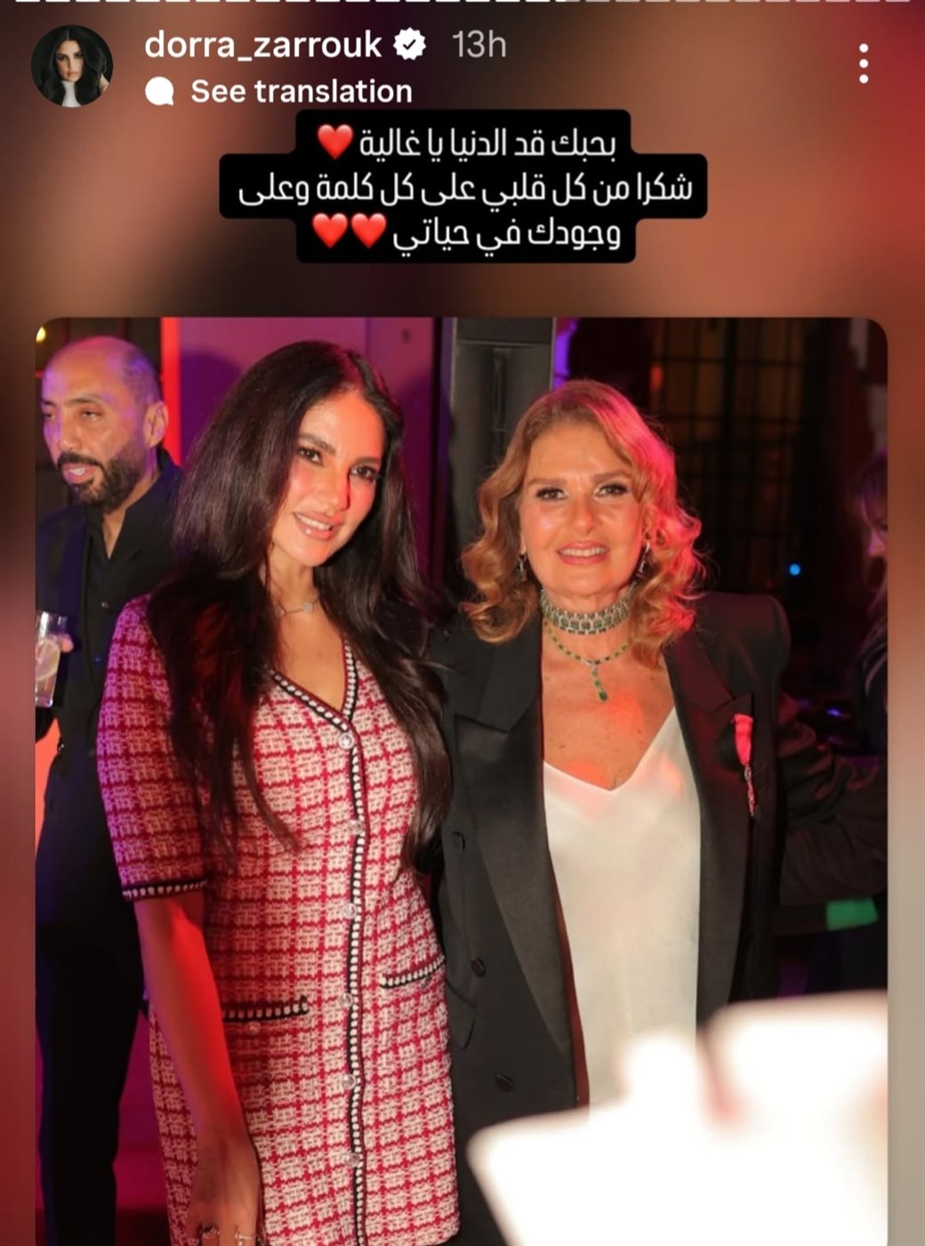 وجهت الفنانة درة رسالة محبة للفنانة يسرا عبر حسابها الرسمي على موقع التواصل الاجتماعي إنستجرام، حيث شاركت صورة تجمعهما، وعلّقت قائلة: "بحبك قد الدنيا يا غالية، شكرًا من كل قلبي على كل كلمة حلوة وعلى وجودك الجميل في حياتي".