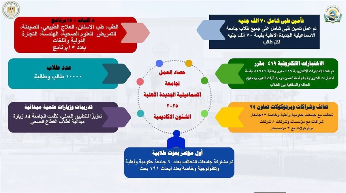 واصلت جامعة الإسماعيلية الأهلية خلال عام 2025، ترسيخ مكانتها ضمن منظومة الجامعات الأهلية الجديدة، محققة حصادًا إيجابيًا عكس تطور الأداء الأكاديمي والإداري، وحرصها على تقديم تعليم جامعي حديث يرتكز على الجودة، والتكامل بين الدراسة النظرية والتطبيق العملي، بما يتماشى مع استراتيجية الدولة لتطوير التعليم العالي.