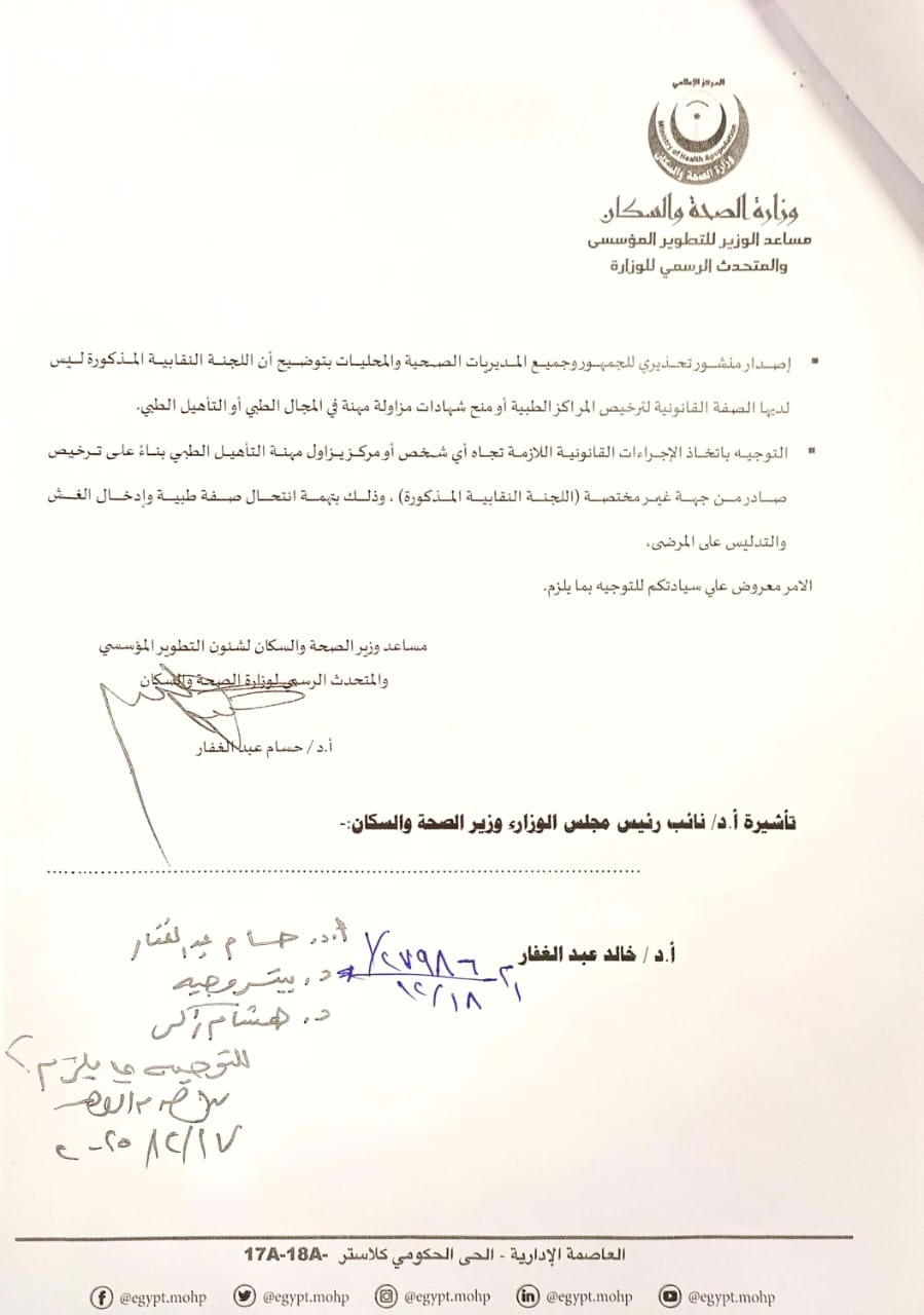 2- إصدار منشور تحذيري للجمهور ولجميع مديريات الصحة والمحافظات بتوضيح أن هذه اللجنة ليس لها أي صفة قانونية لمنح شهادات أو تراخيص في المجال الطبي أو التأهيل الطبي.