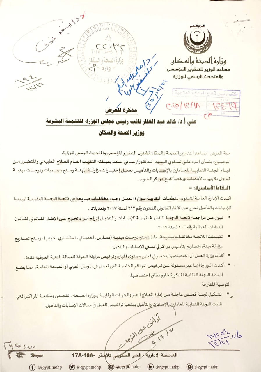 3- التوجيه باتخاذ الاجراءات القانونية اللازمة تجاه أي شخص أو مركز يزاول مهنة التأهيل الطبي بناء على ترخيص صادر من جهة غير مختصة، مثل اللجنة النقابية للعاملين بالإصابات والتأهيل، وذلك بتهمة انتحال صفة طبية وإدخال الغش والتدليس على المرضى.