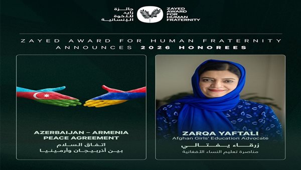 أعلنت جائزة زايد للأخوة الإنسانية اليوم عن المُكرّمين بالجائزة في دورتها السابعة 2026، وهما، اتفاق السلام التاريخي بين أذربيجان وأرمينيا، وزرقاء يفتالي مُناصِرة تعليم النساء الأفغانية، ليكونا بذلك أول الـمُكرَّمين بالجائزة من منطقة القوقاز وأفغانستان.