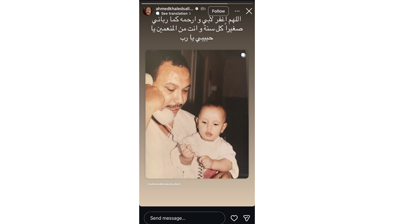 أحيا الفنان أحمد خالد صالح، ذكرى ميلاد والده الفنان الراحل خالد صالح، من خلال خاصية "ستوري"، عبر حسابه الرسمي على تطبيق "إنستجرام"، وكتب: "اللهم اغفر لأبي وارحمه كما رباني صغيرًا، كل سنة وأنت من المنعمين يا حبيبي يا رب".