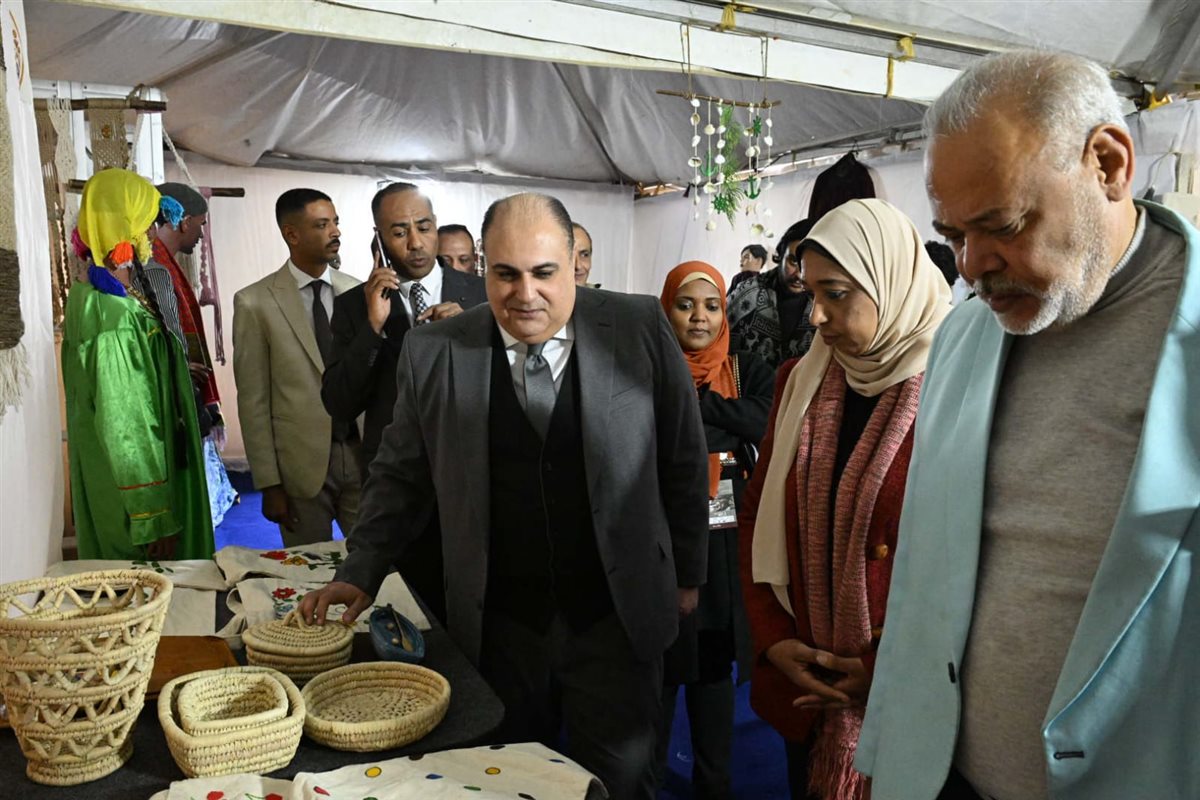 واستهلت الفعاليات بتفقد الحضور لمعرض الحرف البيئية التقليدية والتراثية، الذى يضم منتجات الخيامية، الخوص، الطباعة على القماش، مشغولات الخرز، المكرمية، والجلود.
