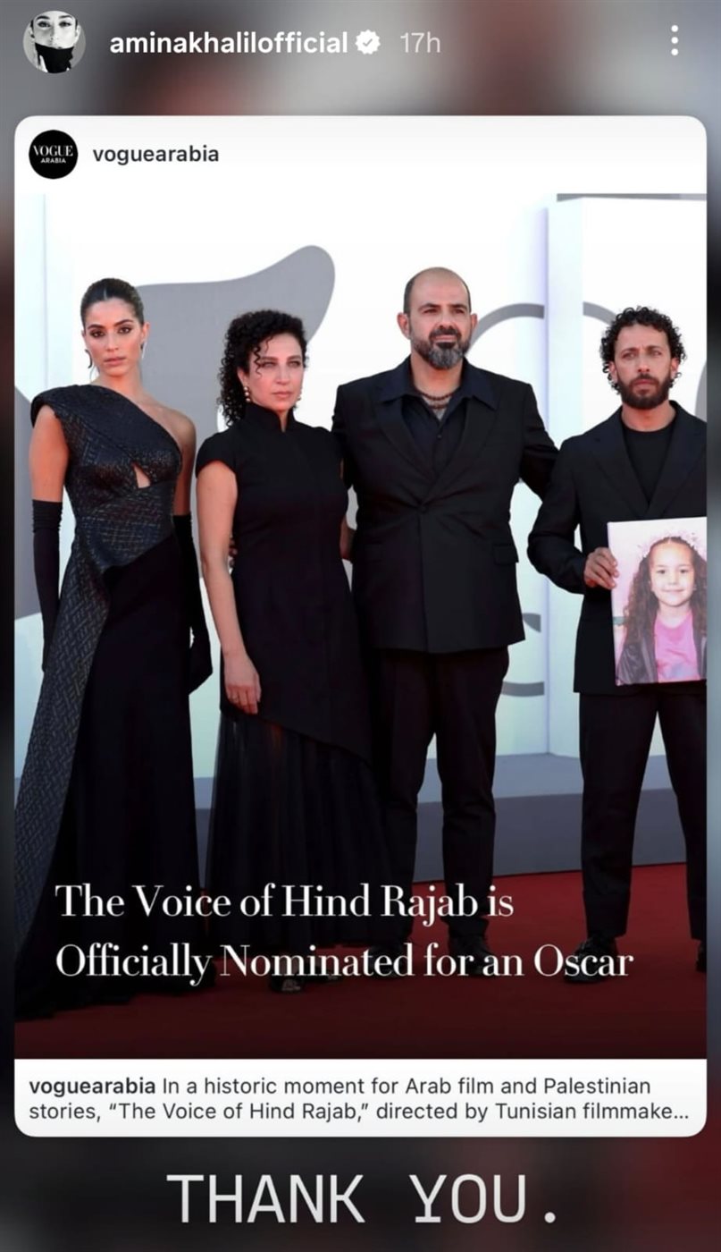 أمينة خليل تدعم الفيلم الفلسطيني "صوت هند رجب" المرشح للأوسكار
