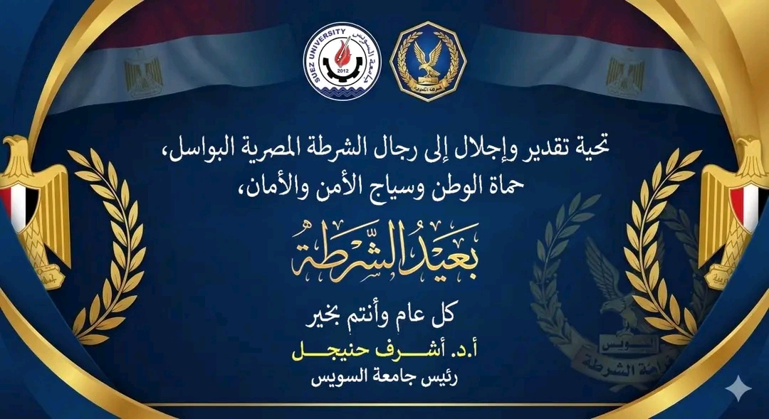 وجّه الأستاذ الدكتور أشرف حنيجل، رئيس جامعة السويس، تحية تقدير وإجلال إلى رجال الشرطة المصرية البواسل، حماة الوطن وسياج الأمن والأمان، وذلك بمناسبة الاحتفال بعيد الشرطة.