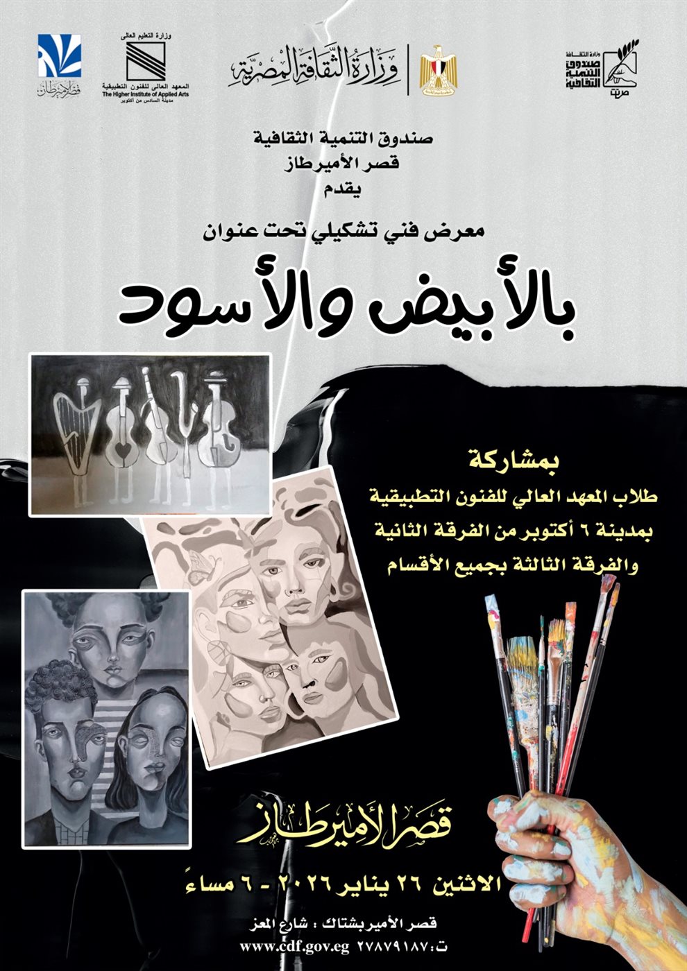 يفتتح مركز إبداع قصر الأمير طاز بالسيوفية، التابع لقطاع صندوق التنمية الثقافية، معرضًا فنيًا بعنوان «بالأبيض والأسود»، وذلك يوم الاثنين الموافق 26 يناير 2026 في تمام الساعة السادسة مساءً.