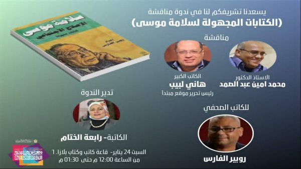 تستضيف قاعة كاتب وكتاب بلازا ١ ضمن فعاليات معرض القاهرة الدولي للكتاب في دورته السابعة والخمسين ندوة الكاتب الصحفي والروائي روبير الفارس عن كتابات مجهولة لسلامة موسى وتناقش ثلاثة إصدارات جديدة لتوثيق المقالات المنشورة في عدة مجلات قديمة للكاتب سلامة موسى.