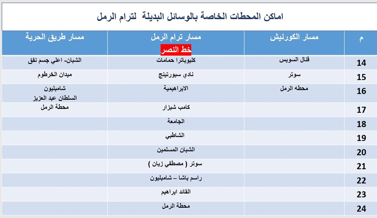 وأكد الفريق أحمد خالد حسن سعيد محافظ الإسكندرية، أنه تم إعداد خطة لتشغيل وسائل النقل البديل أثناء تنفيذ مشروع تطوير ورفع كفاءة ترام الرمل؛ تستهدف تشغيل وسائل النقل البديلة استيعاب عدد الركاب الذين يخدمهم مسار الترام في نفس المحيط الجغرافي لمسار الترام، لافتًا إلى أنه بداية من ١فيراير سيتم تشغيل ١٥٣ وسيلة نقل بديلة “٩٠ ميني باص- ٤٨ ميكروباص- ١٥ اتوبيس" على طول مسار الترام من فيكتوريا و حتى محطة الرمل على ثلاث مسارات وهي ”مسار الكورنيش و مسار طريق الحرية ، ومسار الترام" خطي النصر و باكوس" مع تحديد محطات لوقوف هذه الوسائل لتجنب التوقف العشوائي لها وعلى أن تكون مدة التقاطر من "٣-٥" دقائق في ٣ مسارات ، مشيراً إلى أنه بداية من ١ أبريل ٢٠٢٦ ومع الإيقاف الكلي لمسار الترام وسيتم إضافة ٥٣ وسيلة نقل بديلة مقسمين على المسارات الثلاثة ليكون بإجمالي ٢٠٦ مركبة.