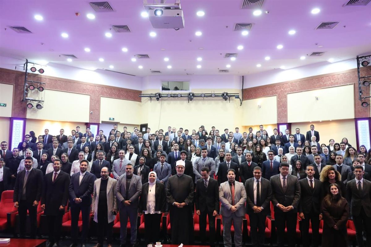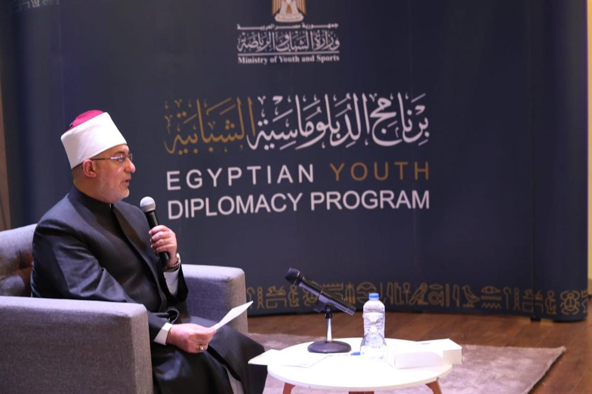 وفي مستهل كلمته، أعرب مفتي الجمهورية عن بالغ شكره وتقديره لوزارة الشباب والرياضة والقائمين على برنامج الدبلوماسية الشبابية، وعن سعادته بحضور هذا اللقاء، مثمِّنًا الجهود المبذولة في إعداد برنامج الدبلوماسية الشبابية، الذي وصفه بأنه ضرورة وطنية تسهم في بناء الوعي، ورفع مستوى التأهيل، وتعزيز قدرة الشباب على الحوار والتفاعل مع القضايا الفكرية والمجتمعية، بما ينعكس إيجابًا على الفرد والمجتمع، مؤكدًا أن موضوع المحاضرة يتقاطع مع علوم وفنون متعددة، تمتد من علم الاجتماع إلى علوم الدين والثقافة، مرورًا بعلوم الشريعة، وصولًا إلى معطيات العصر الحديث، وفي مقدمتها الفضاء الرقمي والذكاء الاصطناعي، وهذا التداخل يفرض تناول الموضوع من زوايا متعددة، مع التركيز على عدد من المحاور الأساسية.