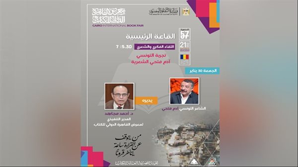 ينظم معرض القاهرة الدولي للكتاب، في دورته السابعة والخمسين، لقاءً فكريًا وشعريًا مع الشاعر التونسي آدم فتحي حول تجربته الشعرية، وذلك في تمام الخامسة والنصف مساء يوم الجمعة 30 يناير الجاري، بالقاعة الرئيسية للمعرض، وتستمر حتى السابعة مساءً.
