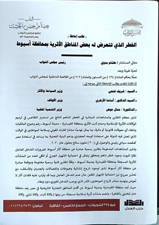وتضمن طلب الإحاطة أن المشاهدات المدعومة بتقارير رسمية صادرة عن منطقة آثار أسيوط تؤكد ضرورة التدخل العاجل، نظرًا لثبوت وجود خطر داهم يتمثل في فقدان أو احتمال الانهيار الجزئي أو الكلي لعدد من المنشآت الأثرية المسجلة بمنطقة القيسارية بمدينة أسيوط، وفقًا لتقارير فنية رسمية موثقة، مع تحذير صريح من احتمالية الانهيار الكامل حال عدم التدخل العاجل، وما يترتب عليه من فقدان آثار لا تعوض وتهديد مباشر لأرواح المواطنين، الأمر الذي يوجب التدخل الفوري دون إبطاء.