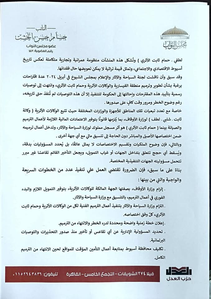 وذكر طلب الإحاطة أن منطقة القيسارية بمدينة أسيوط تعد من أقدم المناطق التجارية التاريخية في صعيد مصر، وتضم منشآت أثرية إسلامية مسجلة، من بينها وكالة ثابت، ووكالة شلبي، ووكالة لطفي، وتشكل هذه المنشآت منظومة عمرانية وتجارية متكاملة تعكس تاريخ أسيوط الاقتصادي والاجتماعي، وتمثل قيمة تراثية لا يمكن تعويضها حال فقدانها، وقد سبق أن أوصت لجنة السياحة والآثار والإعلام بمجلس الشيوخ في أبريل 2024 بعدة اقتراحات لتطوير وترميم منطقة القيسارية والوكالات الأثرية وحمام ثابت الأثري، وانتهت إلى توصيات رسمية بتأييد هذه المقترحات وإحالتها إلى الحكومة للتنفيذ، إلا أن هذه التوصيات لم تُنفذ حتى تاريخه، رغم وضوح الخطر ومرور وقت كافٍ على صدورها.