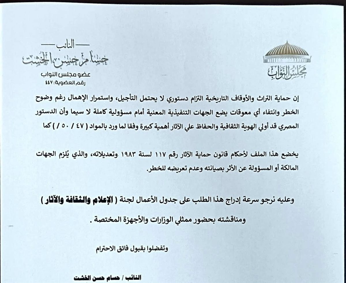 وتقدم النائب حسام حسن الخشت، عضو مجلس النواب، بطلب إحاطة عاجل بشأن «الخطر الداهم» الذي يهدد المناطق الأثرية بمحافظة أسيوط، موجهًا إلى وزير السياحة والآثار، ووزير الأوقاف، ووزيرة التنمية المحلية، موضحًا أن معظم التقارير والمشاهدات المباشرة تشير إلى خطر داهم ناتج عن استمرار التقاعس في ترميم الوكالات الأثرية وحمام ثابت الأثري بمنطقة القيسارية بمدينة أسيوط، رغم وضوح الملكيات وانتفاء أي معوقات قانونية أو مالية، بما يمثل تهديدًا مباشرًا للتراث القومي وسلامة المواطنين، في الوقت الذي تعمل فيه الدولة على استعادة الوجه الحضاري ودعم البنية التحتية، بما يساعد على استعادة مصر كمقصد سياحي رئيسي والوصول إلى 30 مليون سائح بحلول عام 2030.