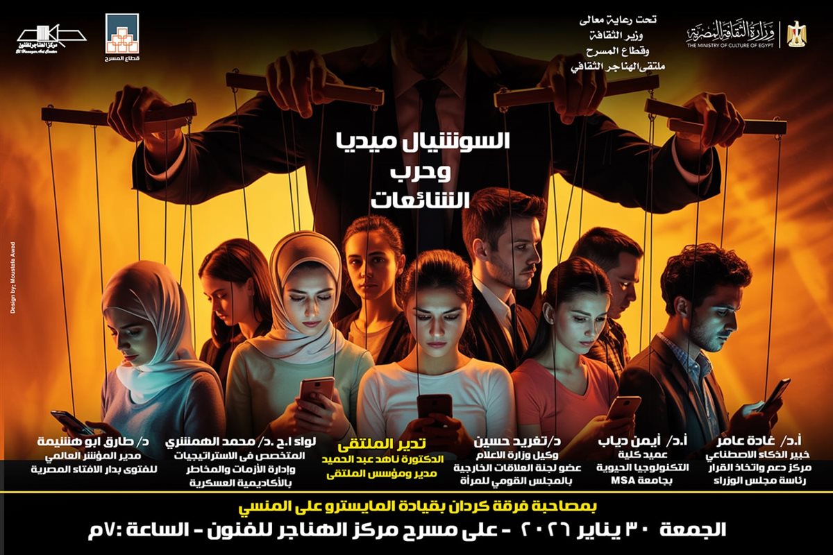 ضمن فعاليات وزارة الثقافة خلال شهر يناير، يقيم قطاع المسرح برئاسة المخرج هشام عطوة، ملتقى الهناجر الثقافي بعنوان «السوشيال ميديا وحرب الشائعات»، في السابعة من مساء غد الجمعة 30 يناير 2026، بمركز الهناجر للفنون برئاسة الفنان شادي سرور.