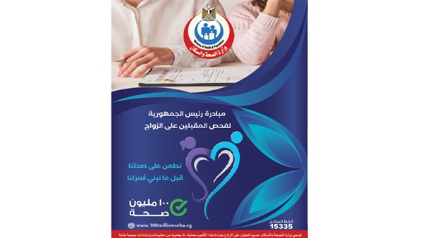 أعلنت وزارة الصحة والسكان إجراء الفحص الطبي لـ4 ملايين و600 ألف شاب وفتاة من المصريين وغير المصريين، ضمن مبادرة رئيس الجمهورية لفحص المقبلين على الزواج، التي انطلقت في فبراير 2023 تحت شعار «100 مليون صحة».