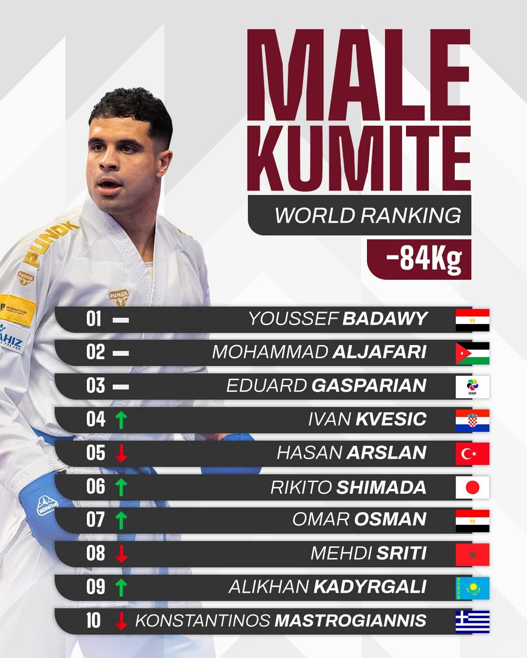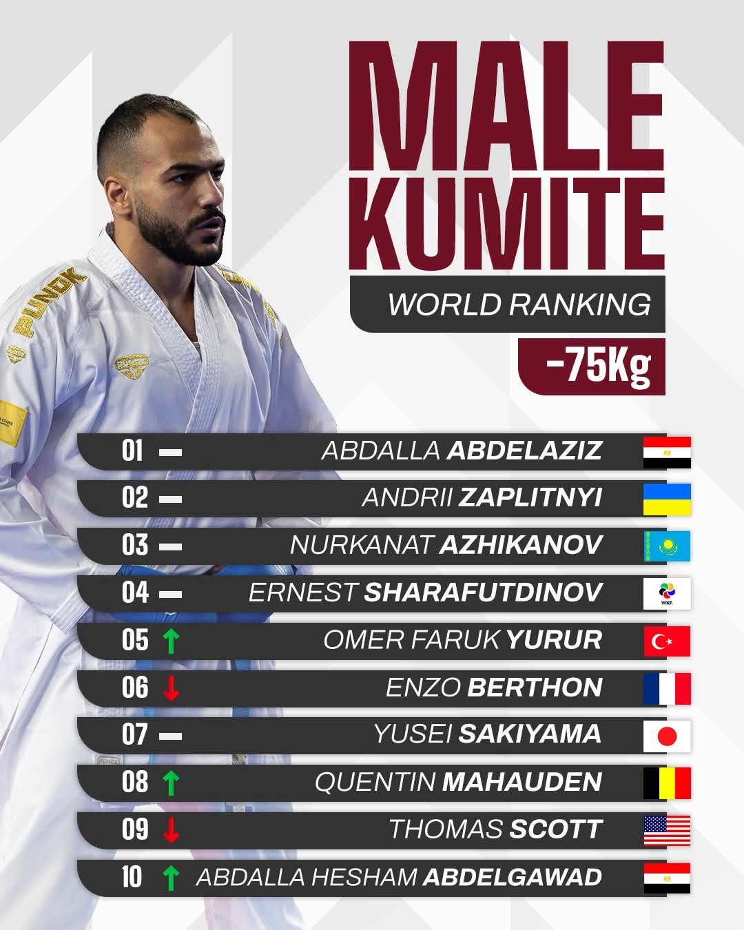 يتصدر عبد الله عبد العزيز قائمة الأفضل عالميًا في وزن -75 كجم للرجال ، فيما يحتل زميله عبد الله هشام عبد الجواد ،المركز العاشر، مما يعكس عمق المنافسة المصرية في هذا الوزن.