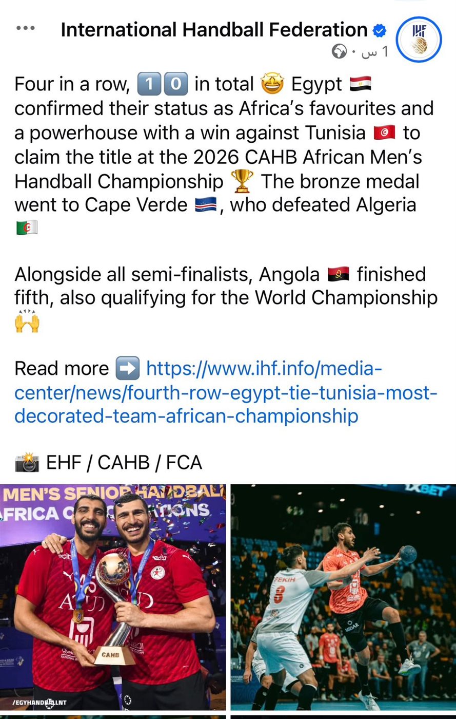 أشاد الموقع الرسمي للاتحاد الدولي لكرة اليد “IHF” بالإنجاز التاريخي الذي حققه المنتخب الوطني المصري لكرة اليد، عقب تتويجه بلقب بطولة إفريقيا للرجال 2026، مؤكدًا أن مصر واصلت ترسيخ مكانتها كقوة عظمى ومرشح أول للسيطرة على القارة الإفريقية.