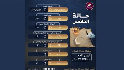 توقعت هيئة الأرصاد الجوية أن يسود اليوم طقس بارد في الصباح الباكر.. دافئ نهارًا على أغلب الأنحاء.. مائل للحرارة على جنوب الصعيد.. وبارد ليلًا على معظم المناطق.