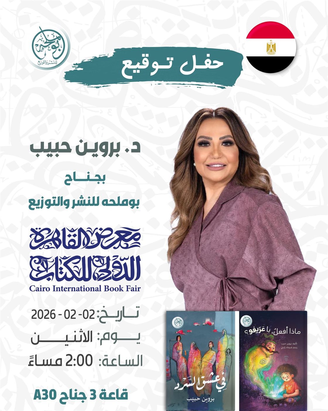 توقع الشاعرة والإعلامية البحرينية بروين حبيب كتابين من تأليفها في الثانية من عصر اليوم بجناح دار بوملحة للنشر والتوزيع في قاعة 3 بمعرض القاهرة الدولي للكتاب في دورته الـ 57 بمركز مصر للمعارض والمؤتمرات الدولية بالتجمع الخامس.