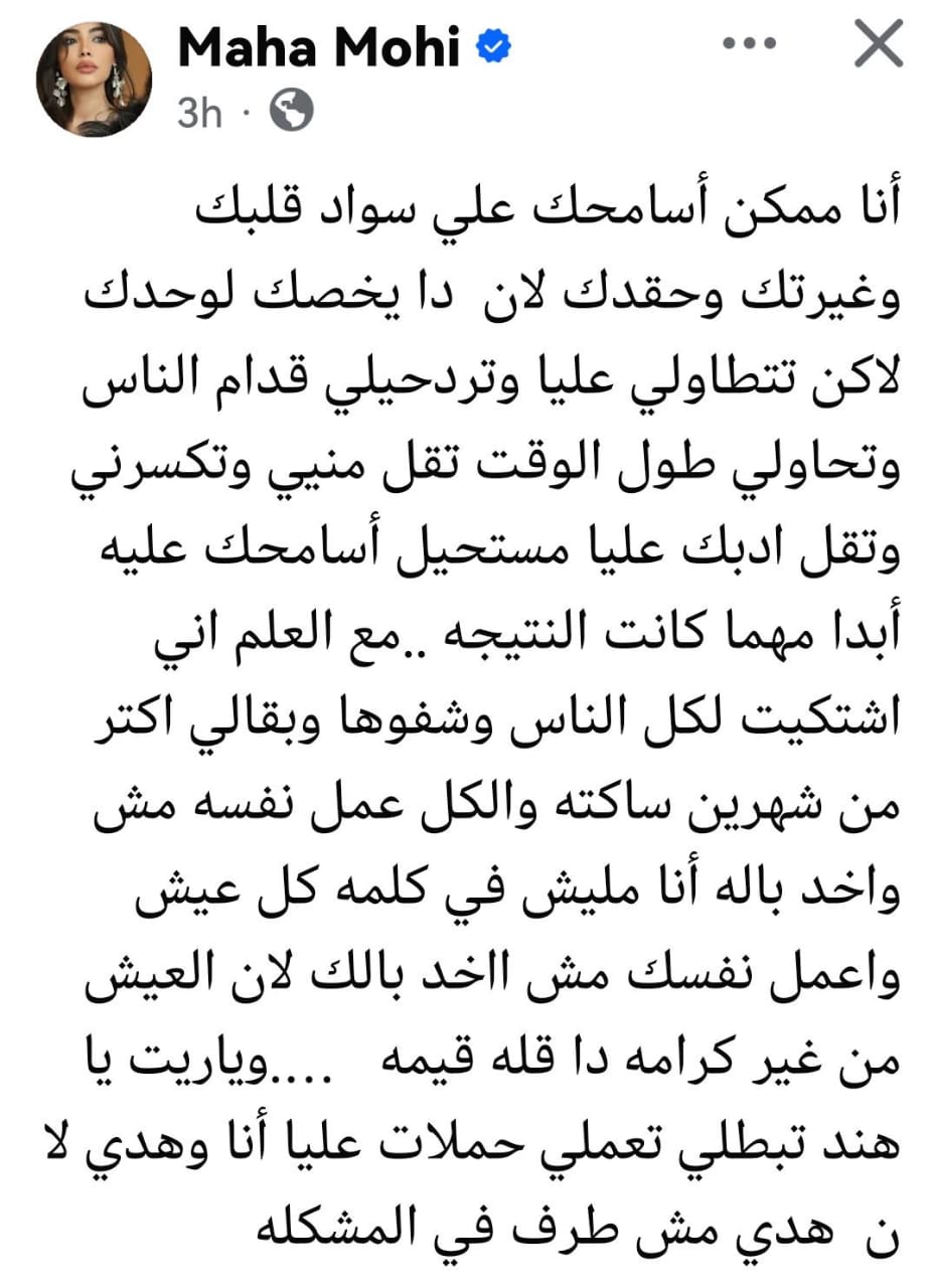 وكتبت مها نصار في منشورها: "أنا ممكن أسامحك على سواد قلبك وغيرتك وحقدك لأن ده يخصك أنت فقط، لكن تتطاولي عليا وتردحيلي قدام الناس وتحاولي طول الوقت تقللي من شأني وتكسريني وتقلي أدبك عليا، مستحيل أسامحك عليه أبدًا مهما كانت النتيجة".