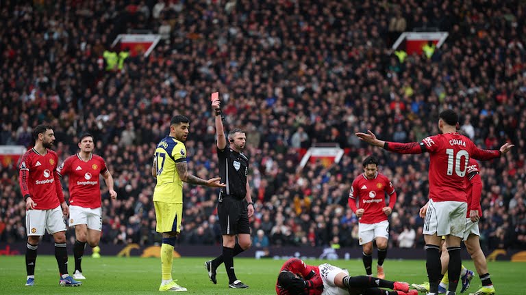 وشهدت المباراة نقطة تحول مبكرة بعدما أشهر حكم اللقاء البطاقة الحمراء في وجه كريستيان روميرو مدافع توتنهام، عقب تدخل عنيف على أحد لاعبي مانشستر يونايتد في الدقيقة 29، ليكمل الفريق اللندني المباراة بعشرة لاعبين، وهو ما استغله أصحاب الأرض لفرض سيطرتهم وحسم المواجهة لصالحهم.