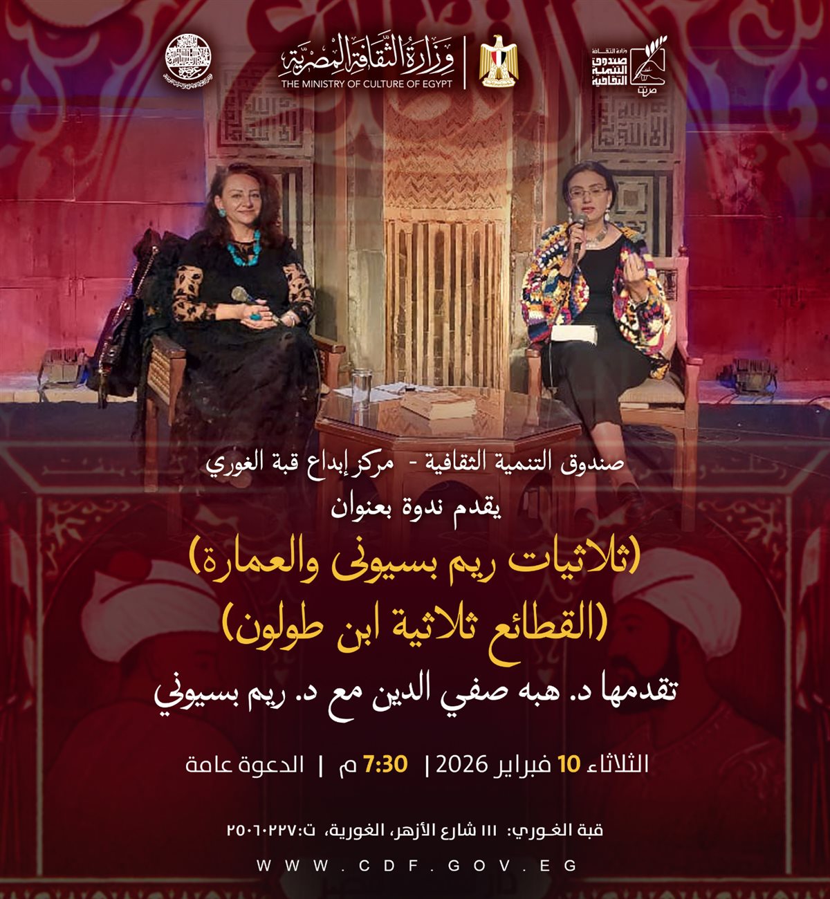 يقدّم مركز إبداع قبة الغوري بشارع الأزهر، التابع لقطاع صندوق التنمية الثقافية، ندوة جديدة ضمن سلسلة ندوات «ثلاثيات ريم بسيوني والعمارة»، للكاتبة د. ريم بسيوني، بعنوان «القطائع.. ثلاثية ابن طولون»، وذلك يوم الثلاثاء الموافق 10 فبراير، في تمام الساعة السابعة والنصف مساءً، حيث تقدّم الندوة وتدير الحوار د. هبة صفي الدين.