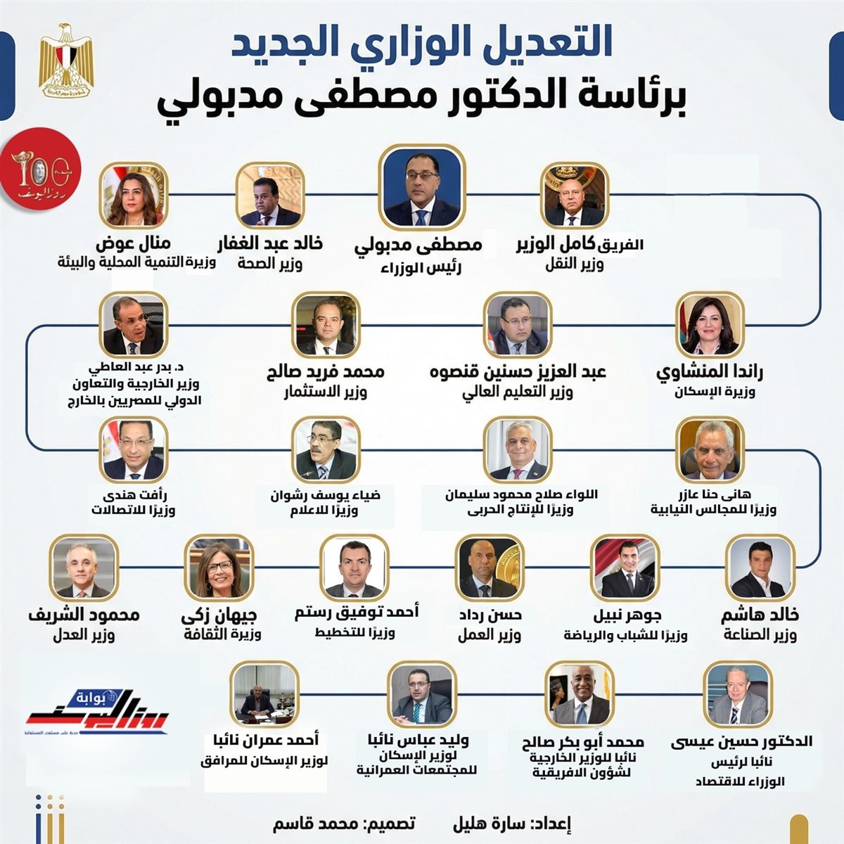 ويضم التعديل الوزاري الجديد 13 وزيرًا جديدًا على رأسهم: محمد فريد وزيرًا للاستثمار والتجارة الخارجية، وعبد العزيز قنصوة وزيرًا للتعليم العالي والبحث العلمي، وراندة المنشاوي وزيرًا للإسكان والمرافق والمجتمعات العمرانية، ورأفت هندي وزيرًا للاتصالات وتكنولوجيا المعلومات، وضياء رشوان وزيرًا للدولة للإعلام، واللواء سعيد سليمان وزيرًا للدولة للإنتاج الحربي، فضلا عن هاني عازر وزيرًا لشؤون المجالس النيابية، ومحمود الشريف وزيرًا للعدل، وجيهان زكي وزيرًا للثقافة، وأحمد رستم وزيرا التخطيط، وحسن الرداد وزيرًا للعمل، وجوهر نبيل وزيرًا للشباب والرياضة، وخالد هاشم وزيرًا للصناعة.