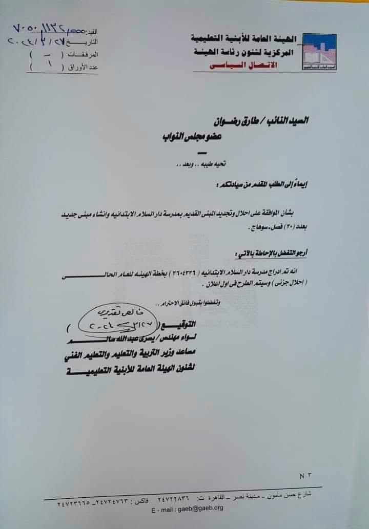 جاء ذلك بحضور المهندس حسن سلامة رئيس هيئة الأبنية التعليمية بسوهاج، والدكتور محمد السيد وكيل وزارة التربية والتعليم، وحسين حبارير رئيس مركز ومدينة دار السلام.