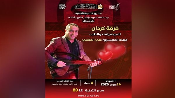 في أجواء احتفالية خاصة بعيد الحب، يستضيف بيت الغناء العربي "قصر الأمير بشتاك" بشارع المعز لدين الله – التابع لقطاع صندوق التنمية الثقافية – حفل فرقة "كردان" للموسيقى والطرب، بقيادة المايسترو علي المنسي، وذلك يوم السبت الموافق 14 فبراير 2026، في تمام الساعة الثامنة مساءً.