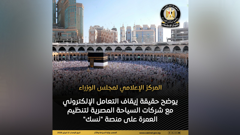 نشر المركز الإعلامي لمجلس الوزراء بيانًا عبر منصاته على مواقع التواصل الاجتماعي، أوضح خلاله حقيقة ما تم تداوله بشأن إيقاف التعامل الإلكتروني مع شركات السياحة المصرية لتنظيم العمرة على منصة "نسك".