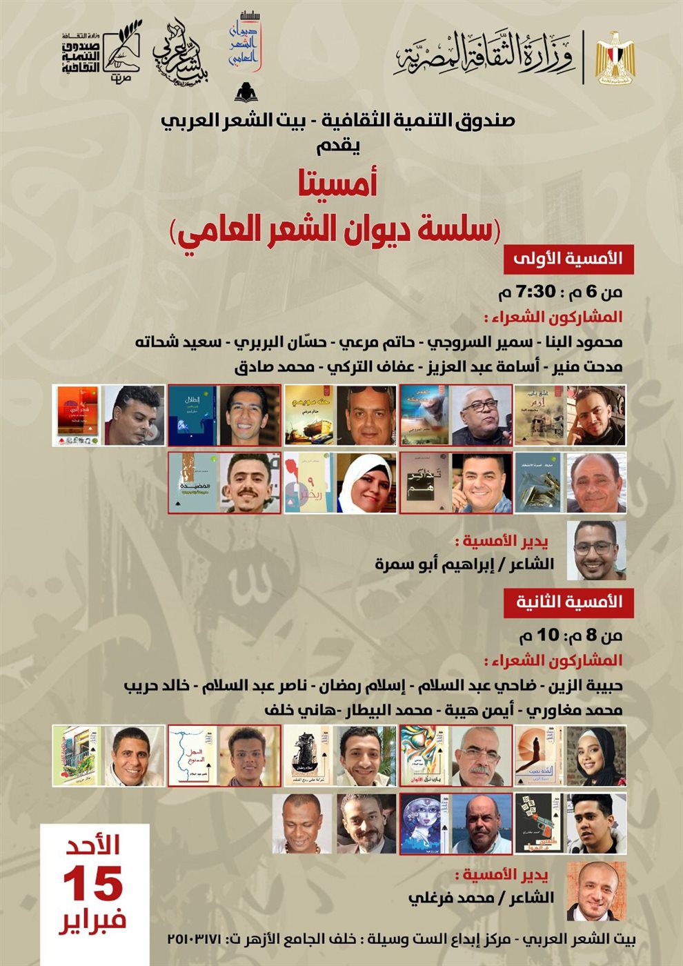 يقدّم مركز إبداع بيت الشعر العربي "بيت الست وسيلة" خلف الجامع الأزهر، التابع لقطاع صندوق التنمية الثقافية، أمسية شعرية جديدة يستضيف من خلالها بعض شعراء سلسلة "ديوان الشعر العامي" التي تصدر عن الهيئة المصرية العامة للكتاب، وذلك في إطار برنامجه الهادف إلى دعم شعر العامية وإتاحة منابر منتظمة للتجارب الشعرية المعاصرة، بعد غد الأحد.
