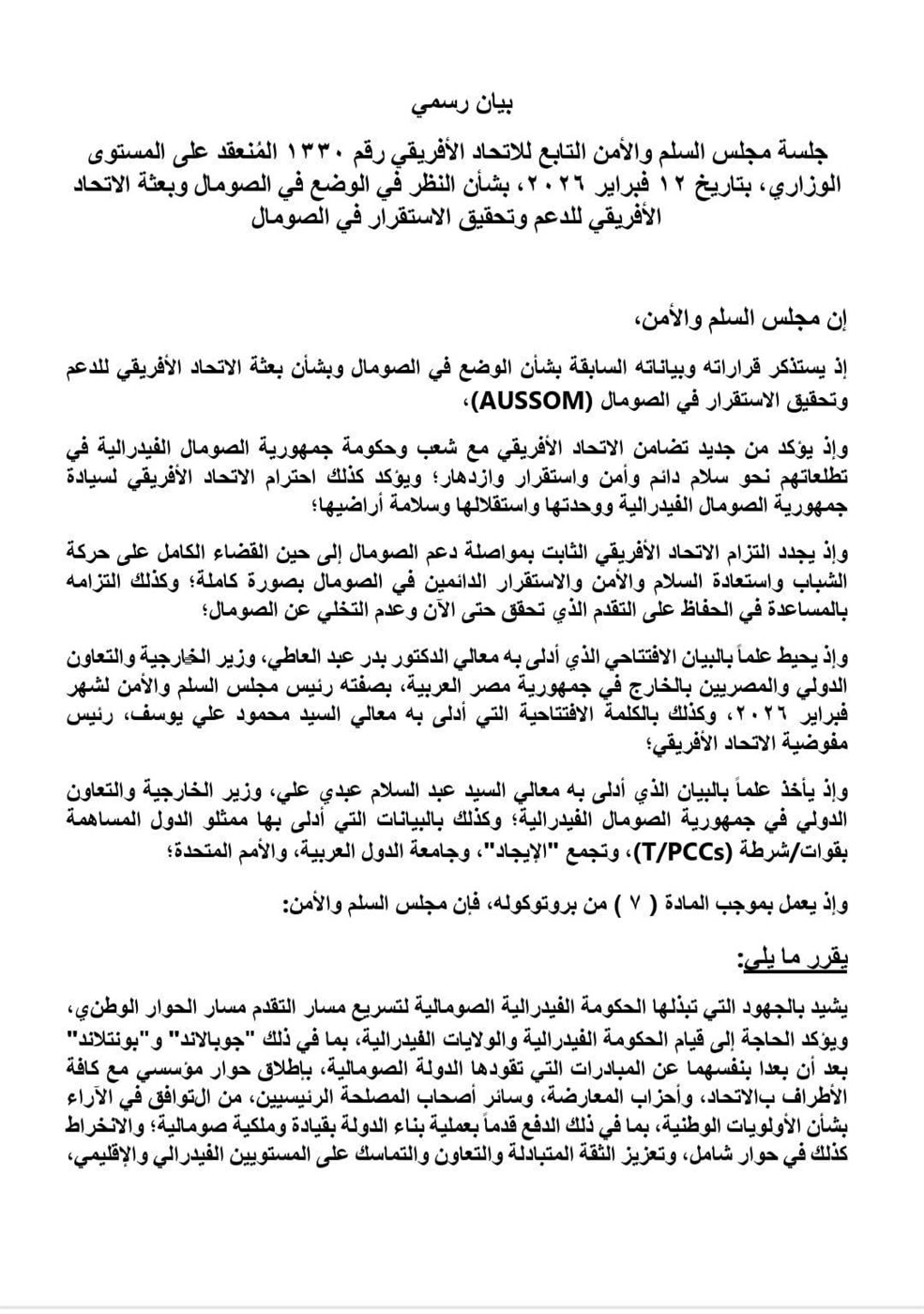 أصدرت وزارة الخارجية والهجرة وشؤون المصريين بالخارج بيانًا أفادت فيه بأن مجلس السلم والأمن التابع للاتحاد الأفريقي اعتمد بيانين بشأن الجلستين الوزاريتين اللتين عُقدتا في 12 فبراير، لمناقشة تطورات الأوضاع في كل من جمهورية الصومال الفيدرالية وجمهورية السودان.