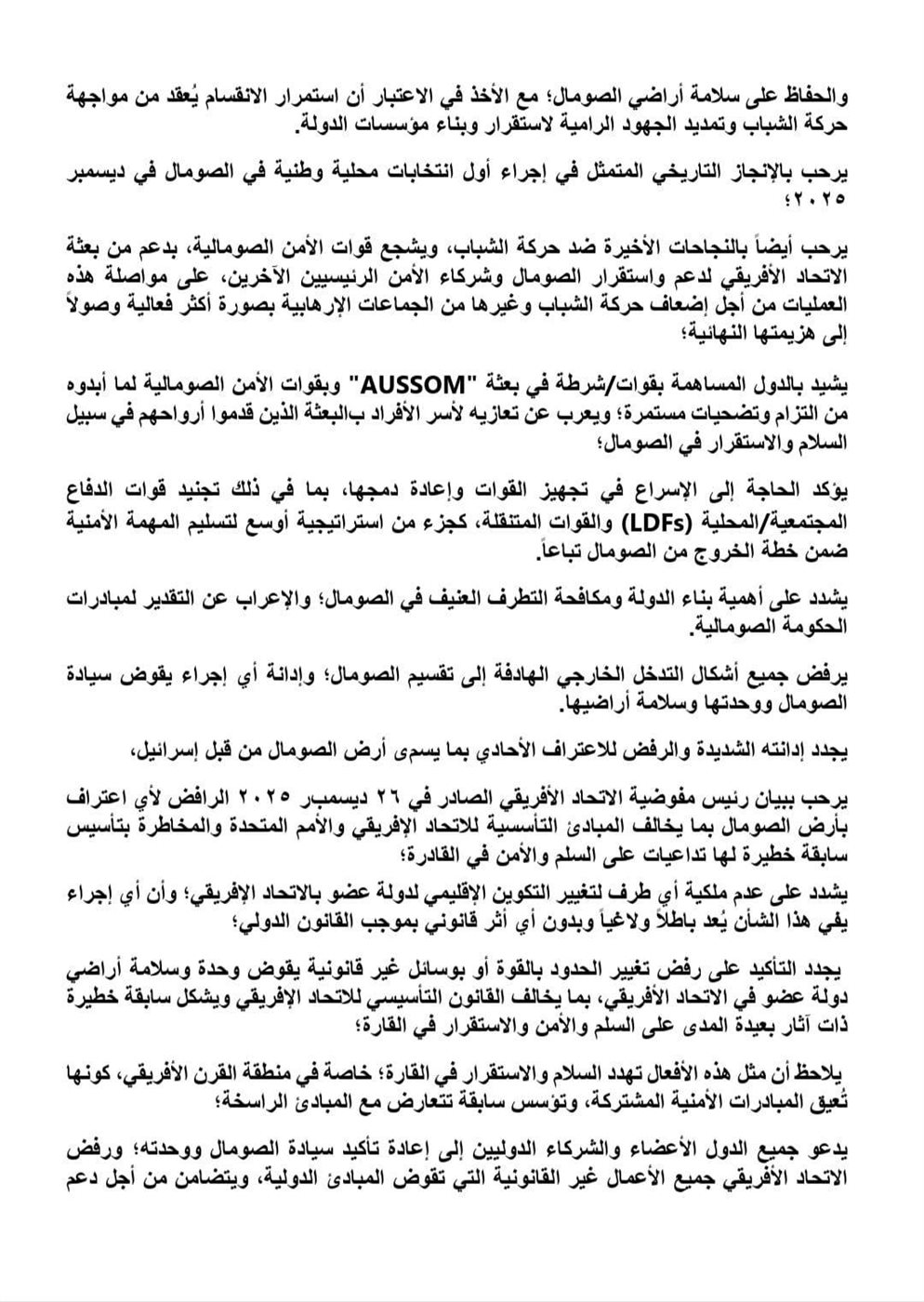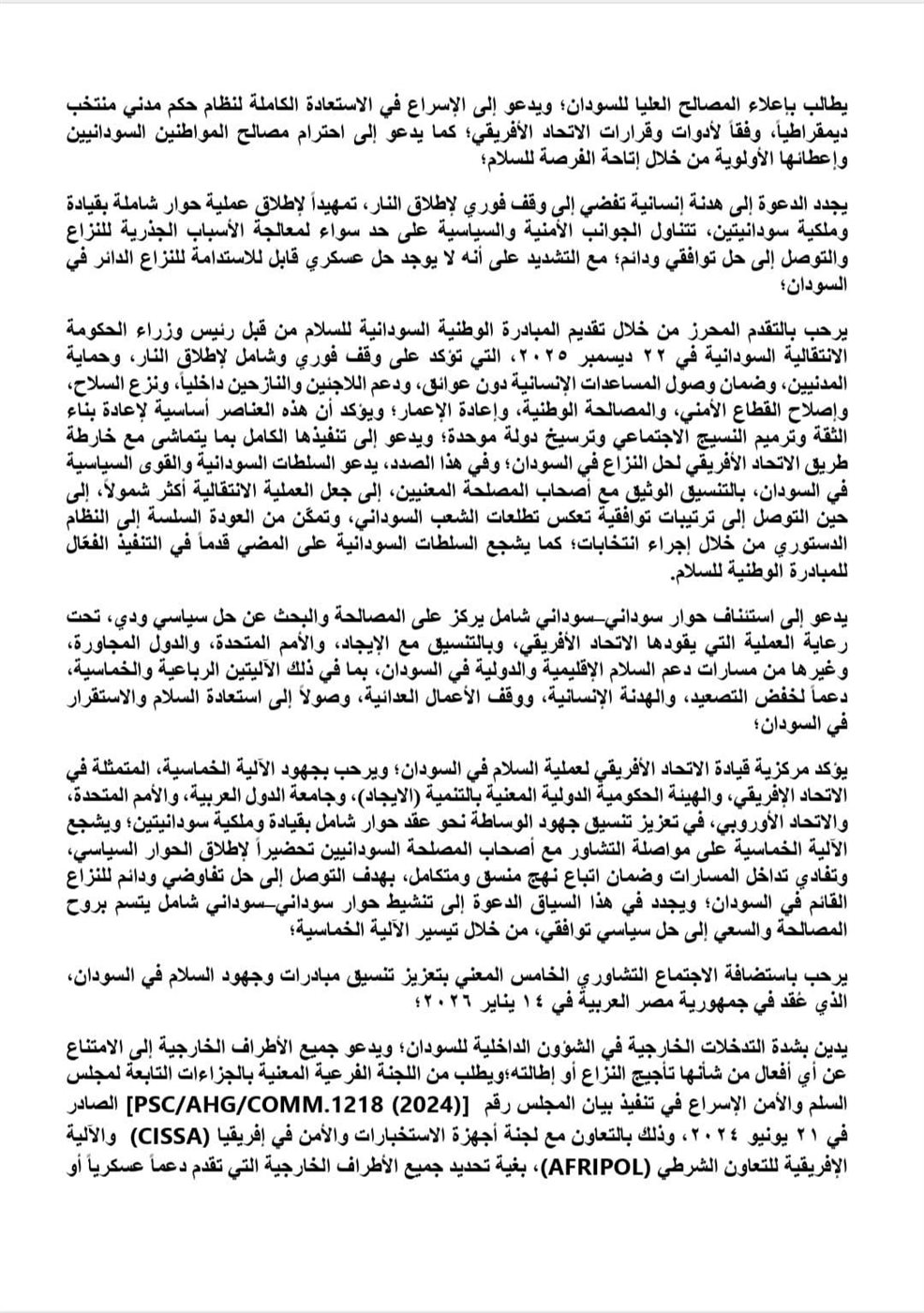 وجدد المجلس التزامه بمواصلة متابعة تطورات الأوضاع في الصومال والسودان، وتفعيل الأدوات المتاحة للاتحاد الأفريقي لدعم مسارات الحلول السياسية والحفاظ على استقرار المنطقة.