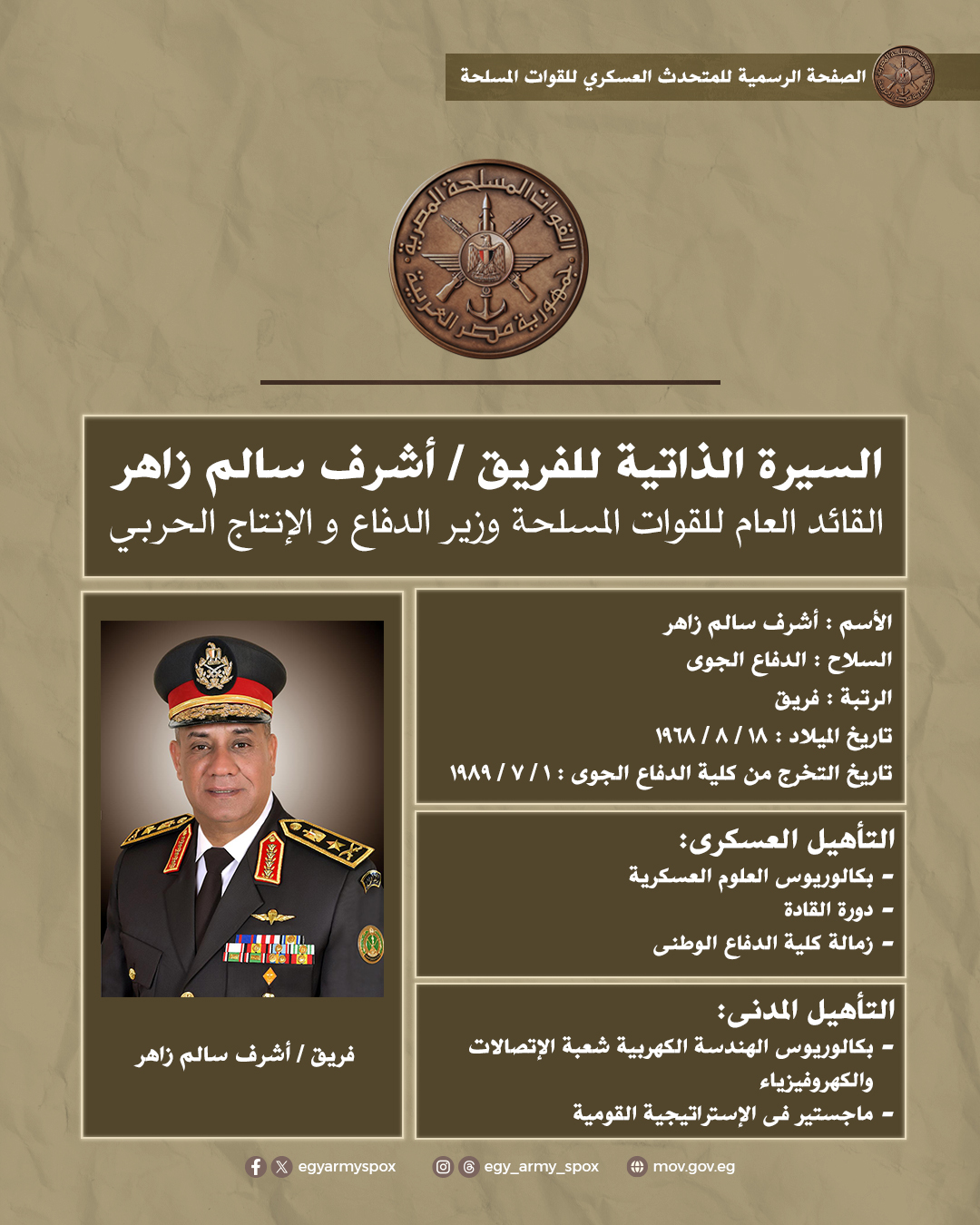السيرة الذاتية للفريق/ أشرف سالم زاهر القائد العام للقوات المسلحة وزير الدفاع والإنتاج الحربى.