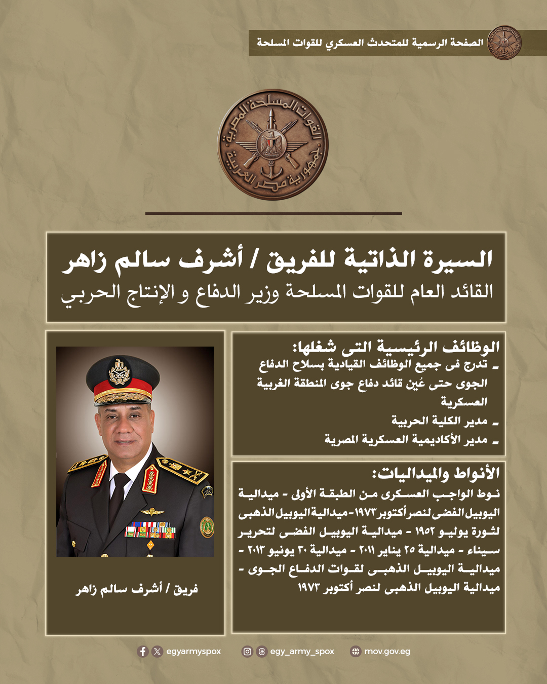 السيرة الذاتية للفريق أشرف سالم زاهر القائد العام للقوات المسلحة