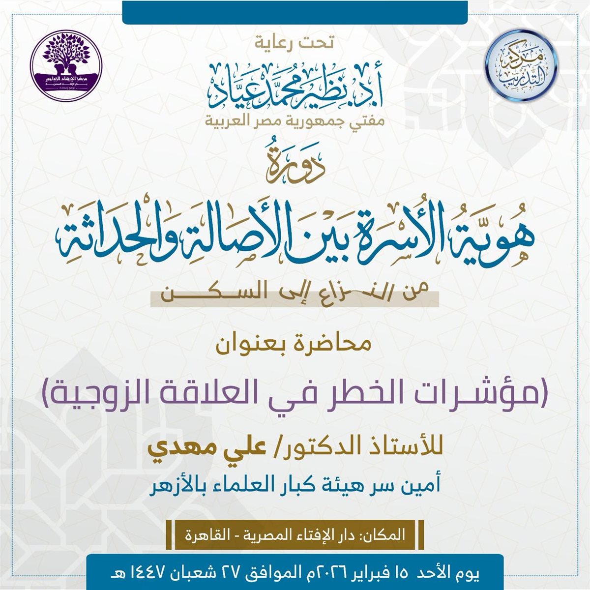 وتتواصل الدورة بمحاضرة مؤشرات الخطر في العلاقة الزوجية التي يقدمها الأستاذ الدكتور علي مهدي أمين سر هيئة كبار العلماء بالأزهر الشريف، مسلطًا الضوء على التحولات المفاهيمية التي قد تنقل العلاقة الزوجية من مساحة تكامل إلى دائرة صراع نتيجة سوء فهم مفاهيم القوامة والمساواة، مع بيان العلامات المبكرة لتسلل الأفكار غير المنضبطة إلى الحياة الزوجية وكيفية استعادة الفهم المتوازن الذي يحفظ استقرار الأسرة.