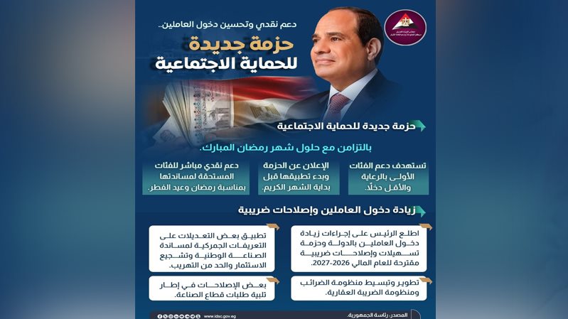 نشر مركز المعلومات ودعم اتخاذ القرار التابع لمجلس الوزراء، عبر صفحته الرسمية على فيسبوك، أن الرئيس عبد الفتاح السيسي وجه الحكومة بالإعلان عن تطبيق حزمة جديدة للحماية الاجتماعية تستهدف دعم الفئات الأولى بالرعاية والأقل دخلًا، وذلك قبل حلول شهر رمضان المبارك.
