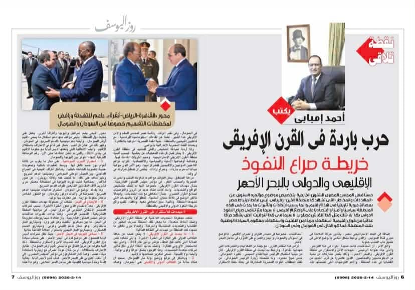 وفي مقاله "نقطة تلاقي" يتحدث الكاتب الصحفي أحمد إمبابي عن الحرب الباردة في منطقة القرن الأفريقي متسائلا: كيف تحافظ مصر على تخوم أمنها القومي؟.. كما يتحدث مبابي بعمق عن المشهد الإقليمي في البحر الأحمر وخريطة صراع النفوذ الدولي.