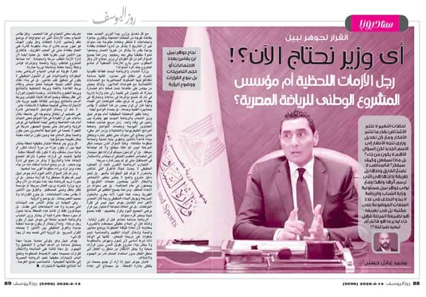 وفي الرياضة موضوع مميز عن وزير الشباب والرياضة الجديد جوهر نبيل تحت عنوان "أي وزير نحتاج الآن؟".