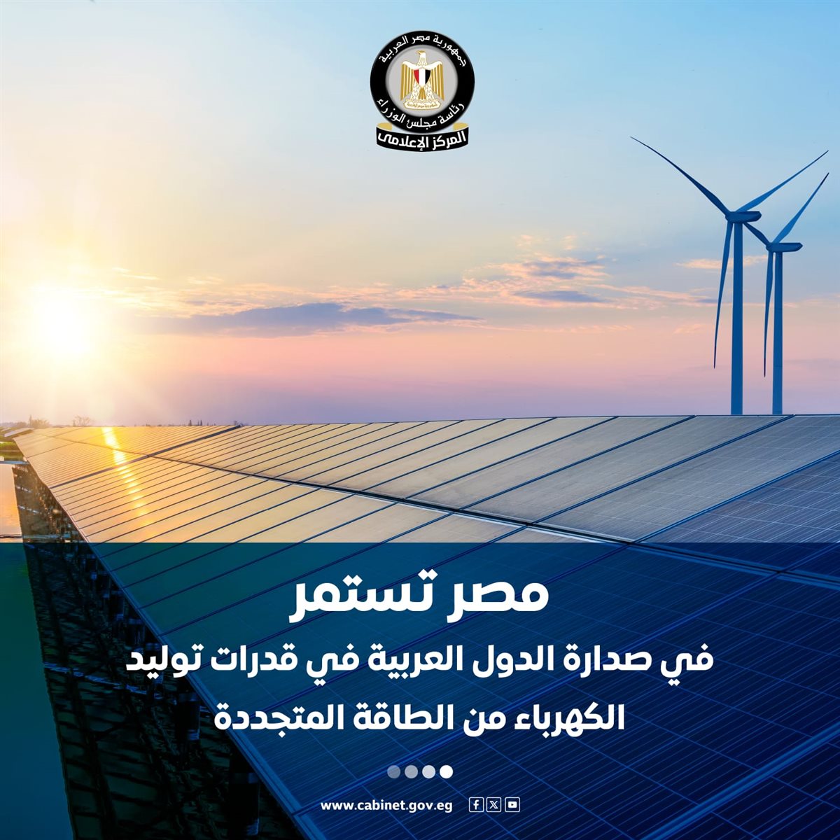 نشر المركز الإعلامي لمجلس الوزراء عددًا من الإنفوجرافات عبر منصاته على مواقع التواصل الاجتماعي، استعرض من خلالها استمرار مصر في صدارة الدول العربية في قدرات توليد الكهرباء من الطاقة المتجددة.