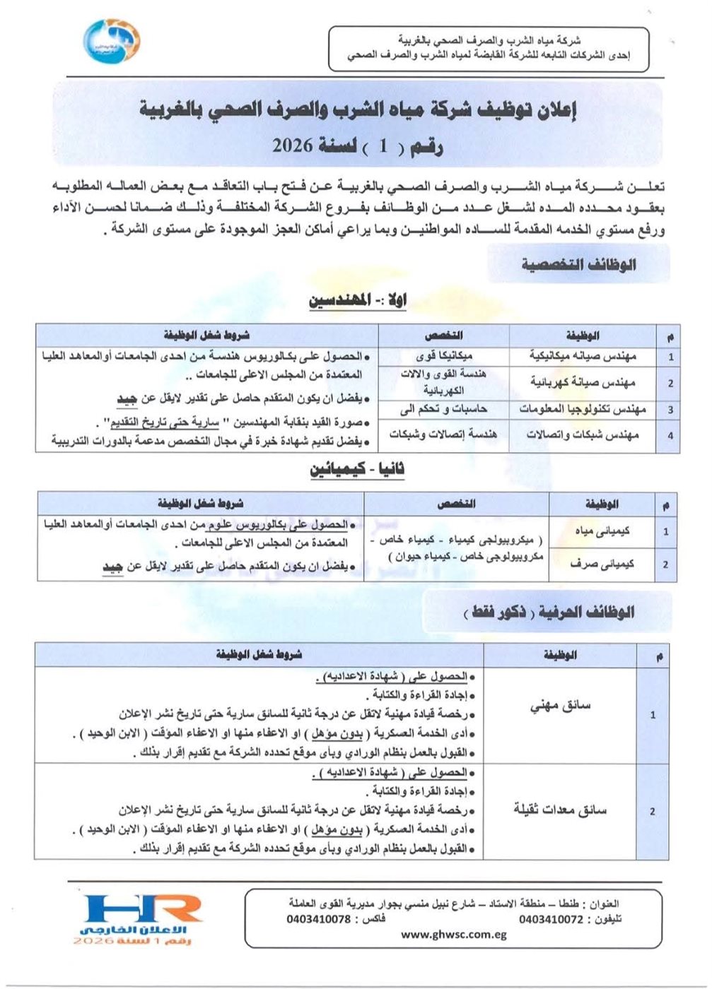 وقال اللواء محمد عبدالفتاح رئيس شركة مياه الغربية، إن الوظائف التخصصية المطلوبة تتضمن المهندسين، مهندس صيانة ميكانيكية تخصص ميكانيكا قوى، ومهندس صيانة كهربائية تخصص هندسة القوى والآلات الكهربائية، ومهندس تكنولوجيا معلومات تخصص حسابات وتحكم آلي، ومهندس شبكات واتصالات تخصص هندسة اتصالات وشبكات، وبالنسبة لوظائف الكيميائيين، كيميائي مياه وكيميائي صرف تخصص ميكروبيولجى كيمياء وكيمياء خاص وميكروبيولوجي خاص وكيمياء حيوان.
