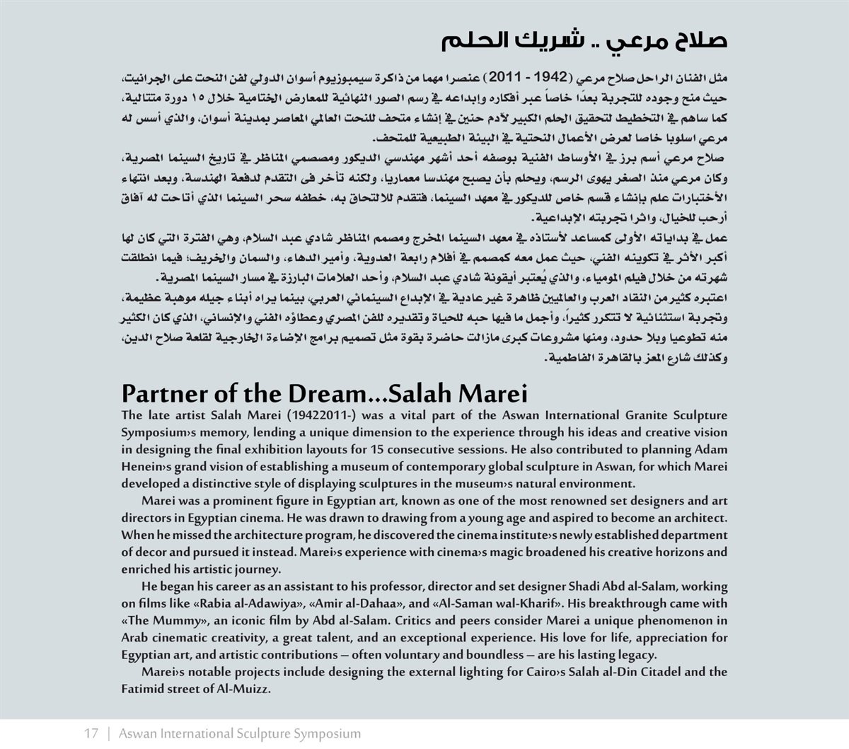 وأعربت المهندسة مريم صلاح مرعي عن سعادتها بالتكريم، مؤكدة أن السيمبوزيوم شكّل جزءًا أصيلًا من حياة والدها ومسيرته الفنية، وأنه كان من أوائل المشاركين في بلورة فكرة إنشائه واختيار موقع المتحف المفتوح بالتعاون مع آدم حنين، حيث عمل على المشروع بشغف وإيمان عميق بقيمته الفنية والإنسانية.
