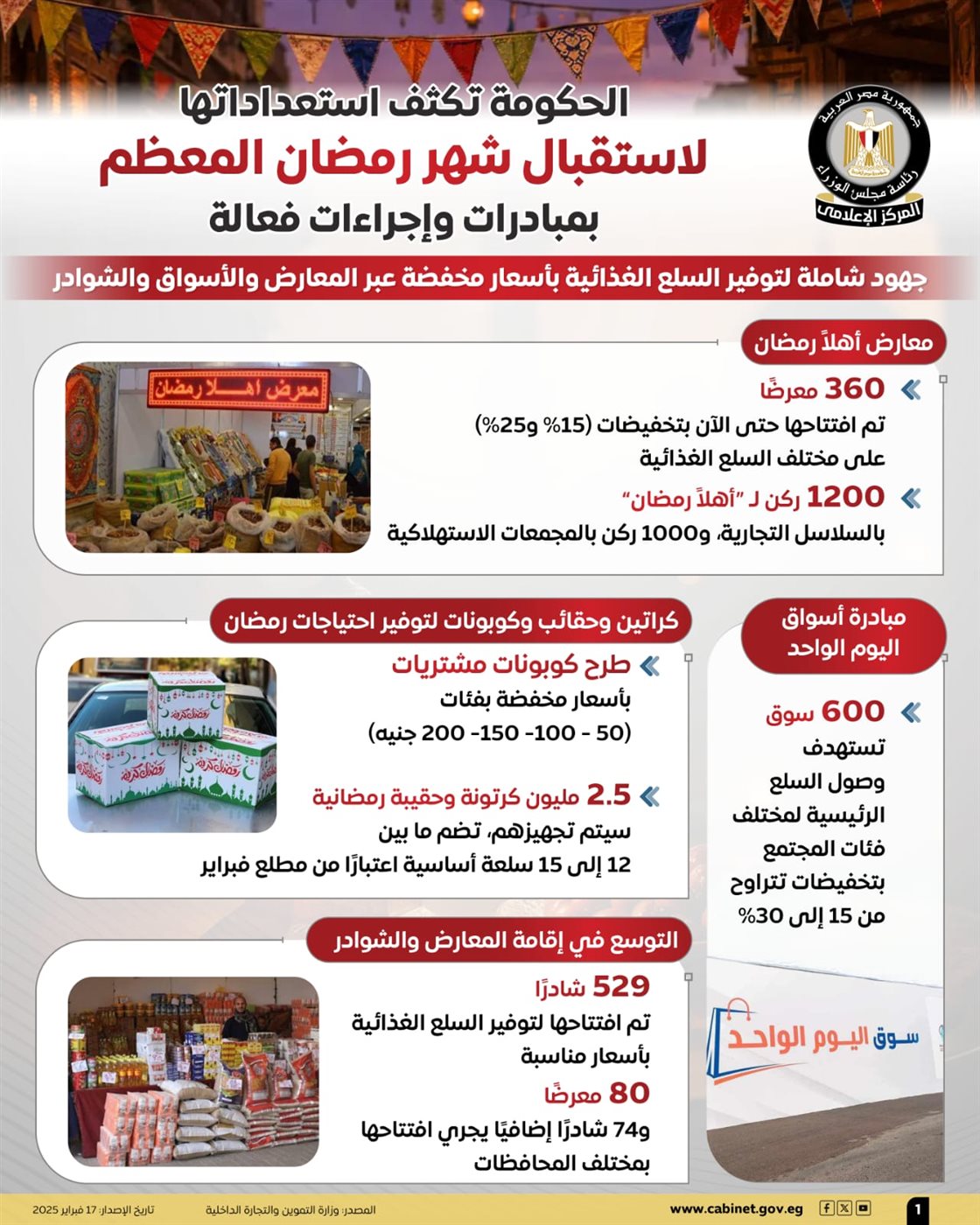 نشر المركز الإعلامي لمجلس الوزراء عددًا من الإنفوجرافات عبر منصاته على مواقع التواصل الاجتماعي، استعرض من خلالها استعدادات الحكومة لاستقبال شهر رمضان المعظم عبر حزمة من المبادرات والإجراءات الهادفة إلى إتاحة السلع الأساسية بأسعار مخفضة، والتوسع في المنافذ والمعارض لتلبية احتياجات مختلف الفئات، وذلك بالتنسيق بين مختلف الجهات المعنية.