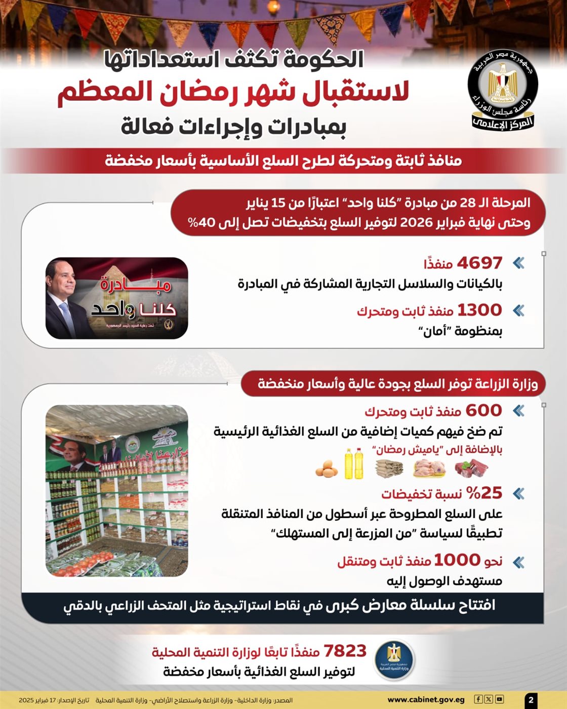 واستعرضت الإنفوجرافات جهود تعزيز توافر السلع الأساسية بأسعار مخفضة في المنافذ الثابتة والمتحركة، حيث تم إطلاق المرحلة الـ 28 من مبادرة "كلنا واحد" اعتبارًا من 15 يناير وحتى نهاية فبراير 2026، لتوفير السلع بتخفيضات تصل إلى 40%، وذلك عبر 4697 منفذًا بالكيانات والسلاسل التجارية المشاركة، بالإضافة إلى 1300 منفذ ثابت ومتحرك بمنظومة "أمان".