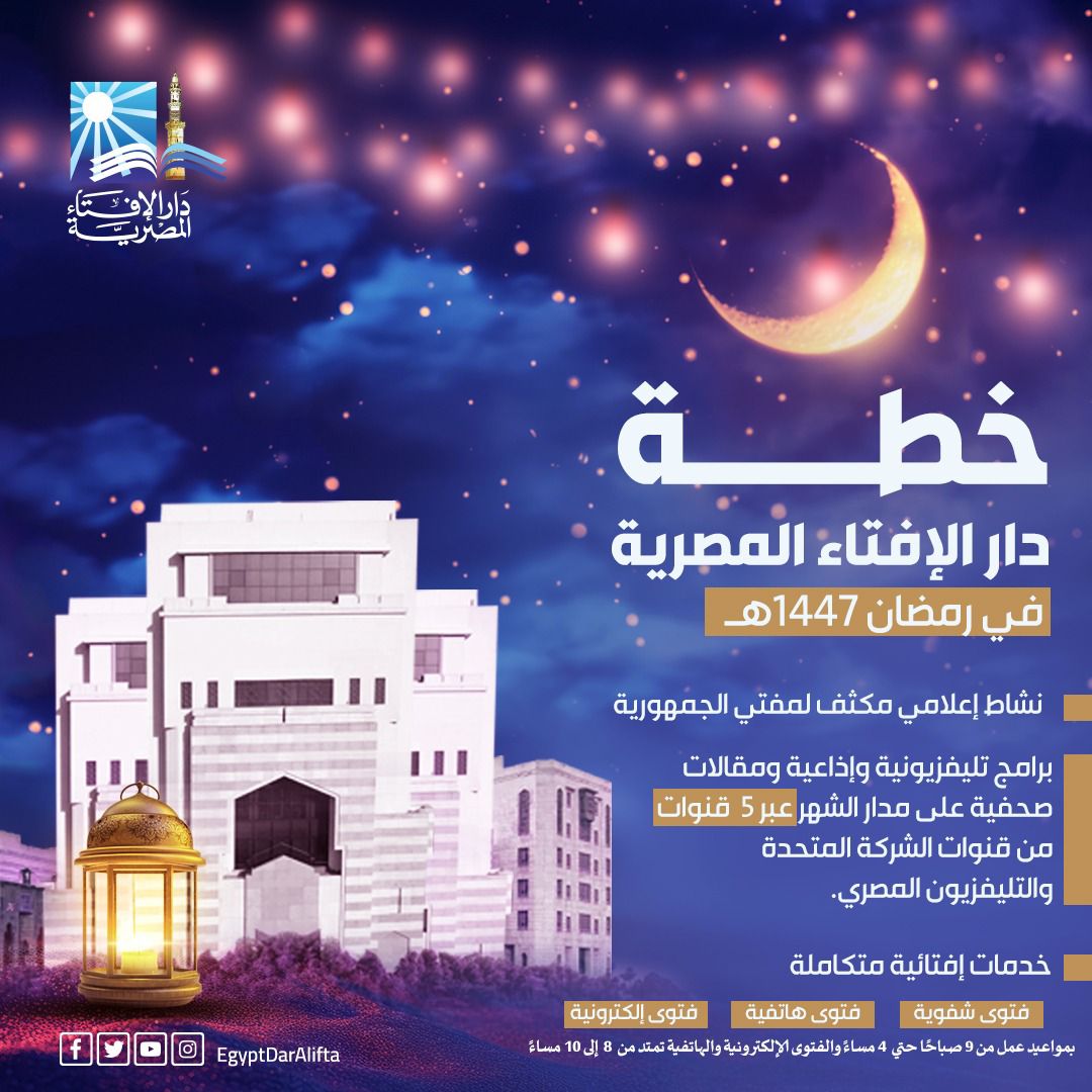 بتوجيهات من فضيلة د. نظير محمد عيَّاد، مفتي الجمهورية، رئيس الأمانة العامة لدور وهيئات الإفتاء في العالم، أعلنت دار الإفتاء المصرية عن خطتها في شهر رمضان المعظم لعام 1447 هجريًّا، والتي تتضمَّن أنشطة دعوية وتوعوية وخدمات إفتائية مكثَّفة للجمهور.